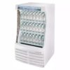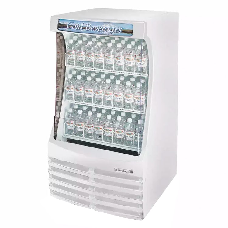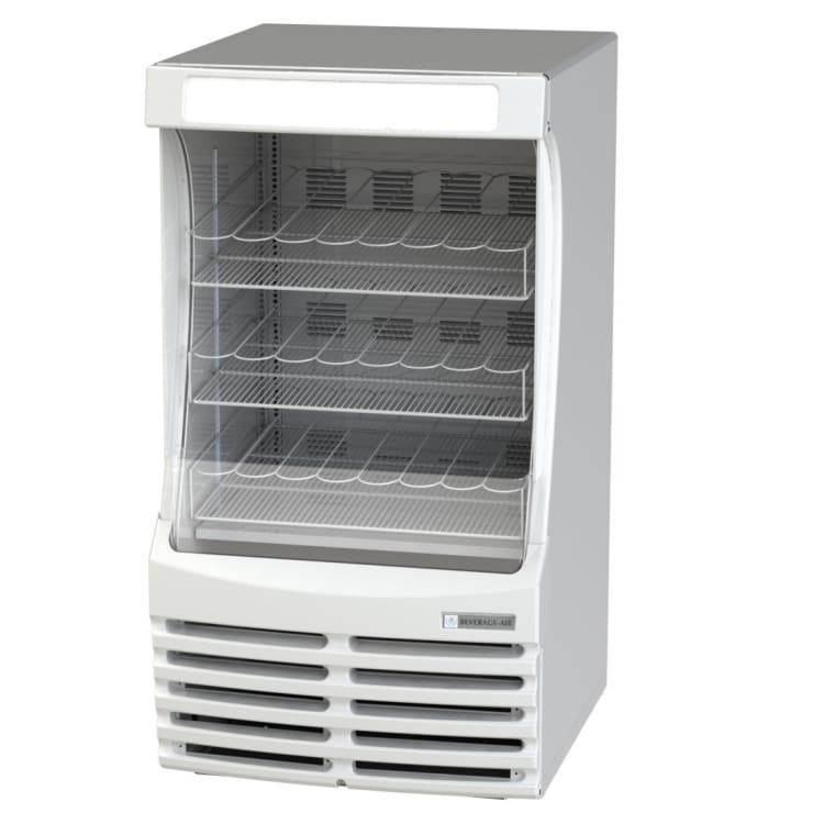 The Beverage Air BZ13-1-W open air merchandiser displays drinks and snacks without a door, ensuring product is accessible. Its modern, curved profile and white finish can fit into almost any setting, and a lit sign panel increases the cabinet’s visibility. Three epoxy-coated shelves resist corrosion and use Gravity-Flo organizers to continuously feed bottles to the front. The cabinet can hold seven 20-ounce drink cases.