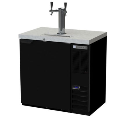 The Beverage Air DD36HC-1-B draft beer cooler can accommodate one half keg in its base. The base cabinet is lined with galvanized steel and has a reinforced stainless steel floor that won’t collapse under the weight of heavy kegs. Its dispenser has two taps so bartenders can fill multiple glasses at once.