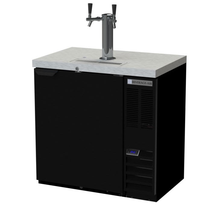 The Beverage Air DD36HC-1-B draft beer cooler has a basic black exterior, but its column and top are made of stainless steel to resist rust. This unit has a self-contained refrigeration system that uses environmentally friendly R290 hydrocarbon refrigerant.