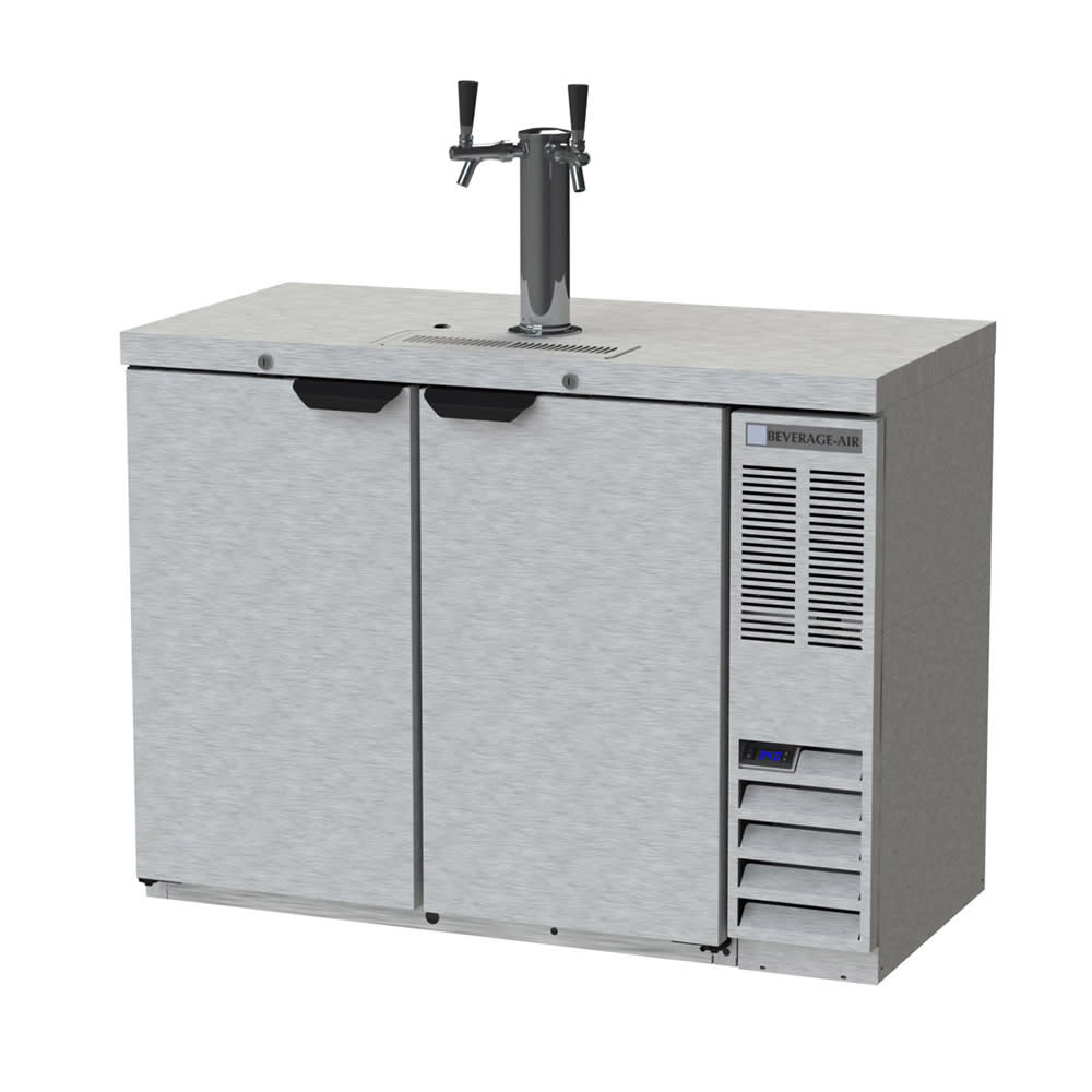 The Beverage Air DD48HC-1-S draft beer system has a self-contained condenser that produces product temperatures between 36 and 38 degrees Fahrenheit. To prevent temperatures from drastically changing, the unit has solid doors that prevent heat transfer and an insulated tower.