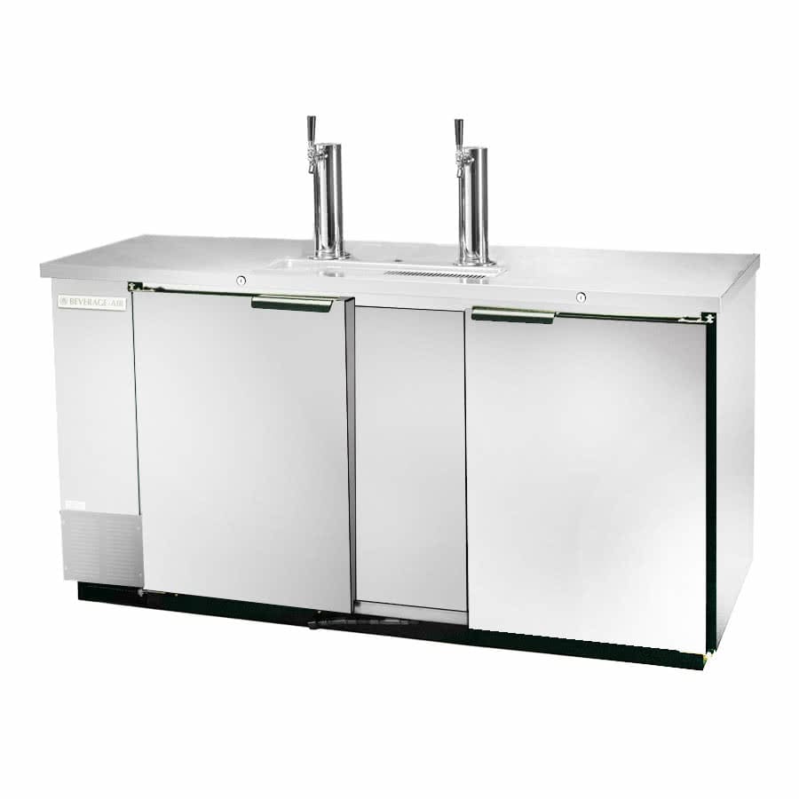 Draft Beer Cooler, 59″ W, 28-3/16″ D, (2) doors, 23.8 cu. ft., (3) keg capacity, door locks, (1) single and (1) dual faucet towers, stainless steel front & top, galvanized interior, self-contained refrigeration, R290 Hydrocarbon refrigerant, 1/3 hp, UL, cUL, UL EPH, NSF, MADE IN USA