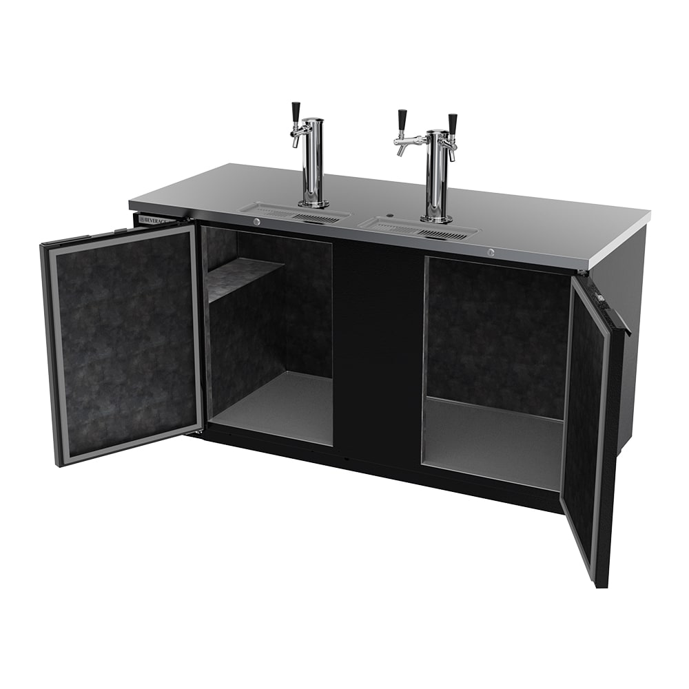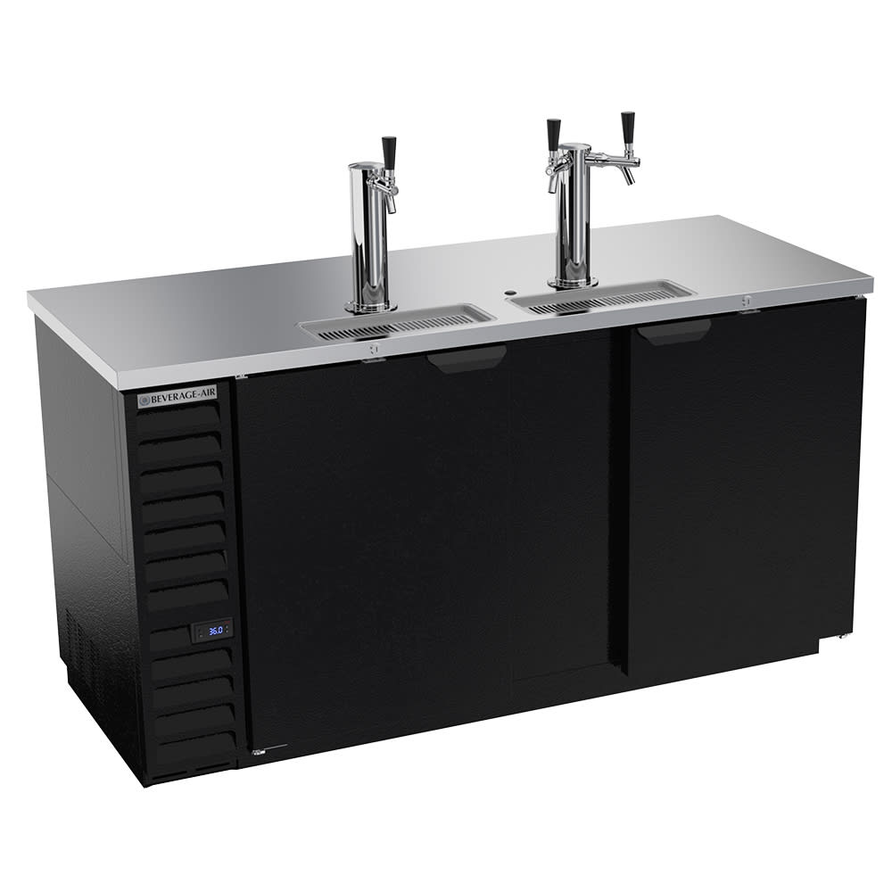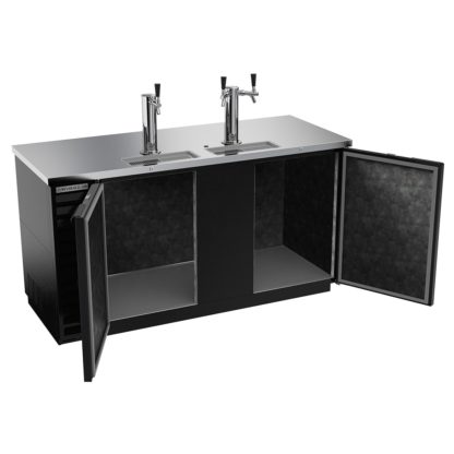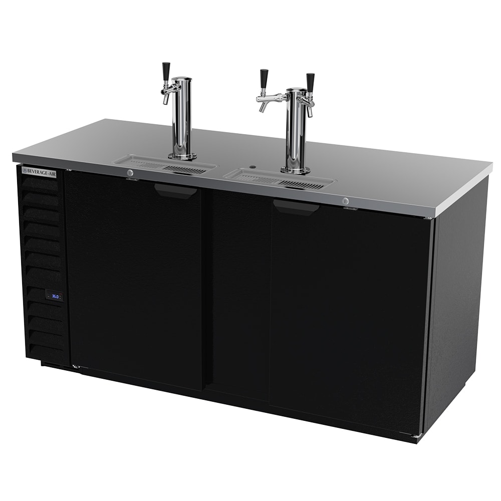 The Beverage Air DD68HC-1-B draft beer system dispenses from one 3-inch single faucet tower and one 3-inch double faucet tower. Each tower is insulated to ensure the beer remains chilled until it is dispensed. The cabinet accommodates three kegs, and the forced air refrigeration system keeps the beer at ideal serving temperatures. Made of galvanized steel, the interior ceiling and walls are heavy duty, and the stainless steel floor can support heavy kegs.