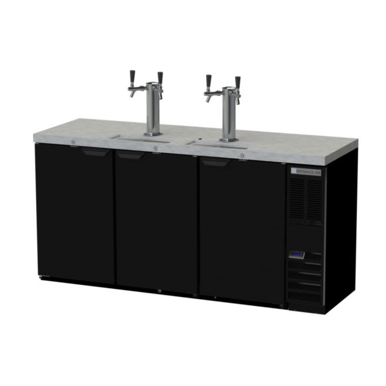 Draft Beer Cooler, 72″ W, 24-3/8″ D, 19.95 cu. ft., (3) doors, (3) keg capacity, door locks, (2) dual angle faucet columns, black exterior, stainless steel top, galvanized interior, self-contained refrigeration, R290 Hydrocarbon refrigerant, 1/3 HP, UL, cULus, UL EPH Classified, UL-Sanitation, MADE IN USA, 115v/60/1ph