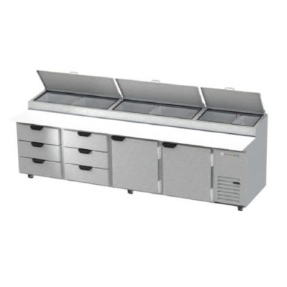 Pizza Top Refrigerated Counter, four-section, 119″W, 42.2 cu. ft., (6) drawers, (1) door, (2) shelves, (5) full size & (1) 1/3 size pan top capacity, stainless steel top with refrigerated pan rail, 19″ cutting board, stainless steel front, sides, top, aluminum interior, side-mounted self-contained refrigeration, R290 Hydrocarbon refrigerant, 1/2 HP, cULus, UL EPH Classified, UL-Sanitation, Made in USA