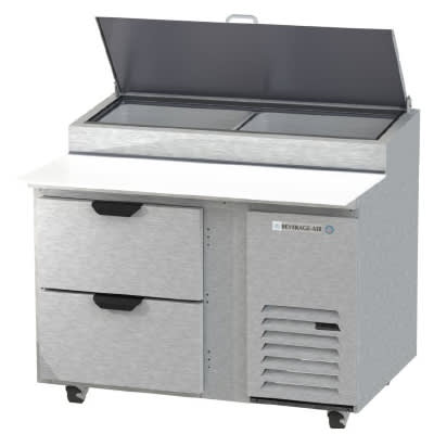Pizza Top Refrigerated Counter, one-section, 46″W, 12 cu. ft., (2) drawers, (2) full size pan top capacity, stainless steel top with refrigerated pan rail, 19″ cutting board, stainless steel front, sides, top, aluminum interior, side-mounted self-contained refrigeration, R290 Hydrocarbon refrigerant, 1/2 HP, cULus, UL EPH Classified, UL-Sanitation, Made in USA
