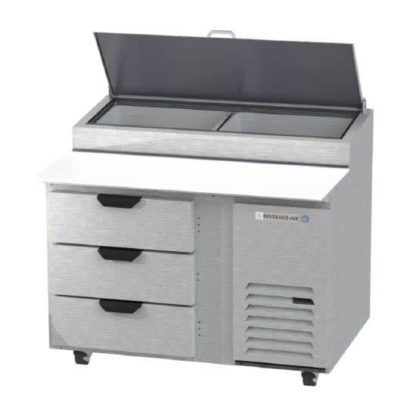Pizza Top Refrigerated Counter, one-section, 46″W, 12 cu. ft., (3) drawers, (2) full size pan top capacity, stainless steel top with refrigerated pan rail, 19″ cutting board, stainless steel front, sides, top, aluminum interior, side-mounted self-contained refrigeration, R290 Hydrocarbon refrigerant, 1/2 HP, cULus, UL EPH Classified, UL-Sanitation, Made in USA