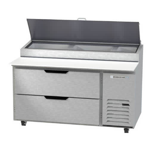 So it can be cleaned between uses, the Beverage Air DPD60HC-2 pizza prep table’s polyethylene cutting board is removable. It utilizes environmentally friendly R290 refrigerant to maintain temperatures between 36 and 38 degrees Fahrenheit. This unit has an interior capacity of 17.8 cubic feet and features two drawers.