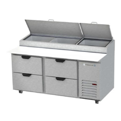 Pizza Top Refrigerated Counter, two-section, 67″W, 20.7 cu. ft., (4) drawers, (3) full size pan top capacity, stainless steel top with refrigerated pan rail, 19″ cutting board, stainless steel front, sides, top, aluminum interior, side-mounted self-contained refrigeration, R290 Hydrocarbon refrigerant, 1/2 HP, cULus, UL EPH Classified, UL-Sanitation, Made in USA