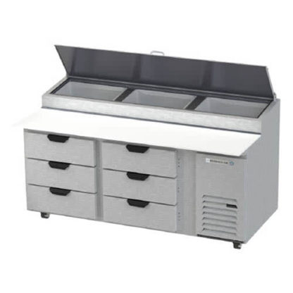 Pizza Top Refrigerated Counter, two-section, 72″W, 22.8 cu. ft., (6) drawers, (3) full size pan top capacity, stainless steel top with refrigerated pan rail, 19″ cutting board, stainless steel front, sides, top, aluminum interior, side-mounted self-contained refrigeration, R290 Hydrocarbon refrigerant, 1/2 HP, cULus, UL EPH Classified, UL-Sanitation, Made in USA