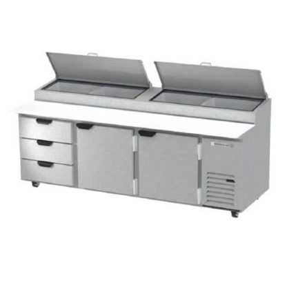 Pizza Top Refrigerated Counter, three-section, 93″W, 31.5 cu. ft., (3) drawers, (2) doors, (4) shelves, (4) full size pan top capacity, stainless steel top with refrigerated pan rail, 19″ cutting board, stainless steel front, sides, top, aluminum interior, side-mounted self-contained refrigeration, R290 Hydrocarbon refrigerant, 1/2 HP, cULus, UL EPH Classified, UL-Sanitation, Made in USA