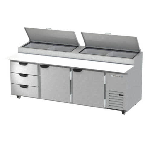 Offering plenty of space to prepare any size of pizza, the Beverage Air DPD93HC-3 prep table is 93 inches wide with a 19-inch cutting board on the top. The refrigerated pan rail holds four full-size food pans in the range of 36 to 38 degrees Fahrenheit to ensure freshness. Because the lid is insulated, none of this chill seeps out of the unit. It cools with a self-contained, side-mounted refrigeration system that uses environmentally safe R290 hydrocarbon refrigerant.