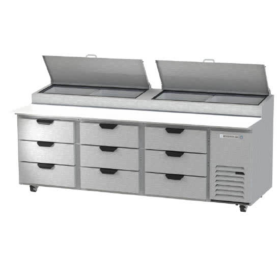 Pizza Top Refrigerated Counter, three-section, 93″W, 31.5 cu. ft., (9) drawers, (4) full size pan top capacity, stainless steel top with refrigerated pan rail, 19″ cutting board, stainless steel front, sides, top, aluminum interior, side-mounted self-contained refrigeration, R290 Hydrocarbon refrigerant, 1/2 HP, cULus, UL EPH Classified, UL-Sanitation, Made in USA