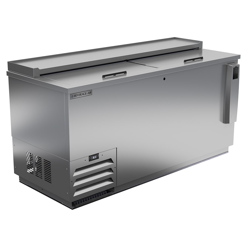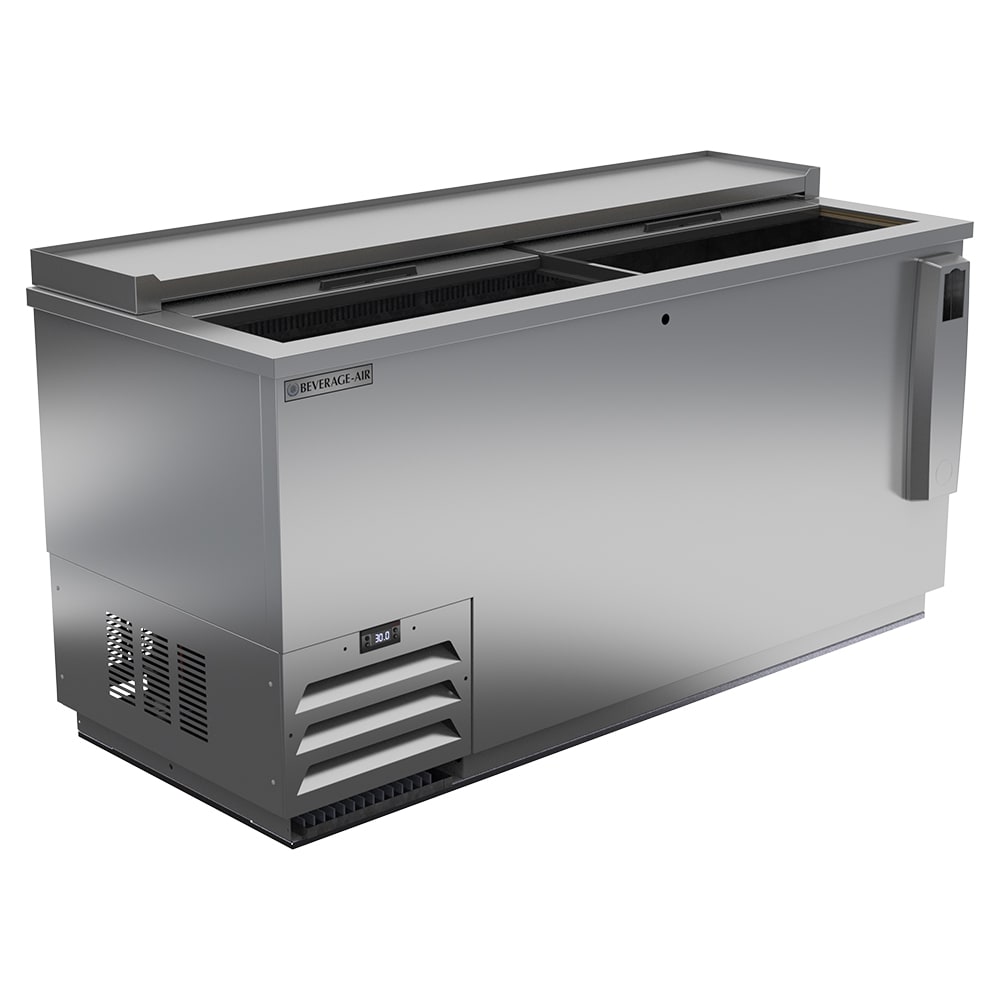 The Beverage Air DW64HC-S-29 forced-air bottle cooler has a deep well and 18.5 cubic feet of interior space, creating enough room for 25 cases of bottles or 34 cases of cans. When a bottle is retrieved behind one of the two sliding lids, employees can pop off the cap using the built-in bottle opener. A cap catcher captures the lid to prevent it from falling to the floor. Streamlining retrieval, the cabinet comes with three wire dividers to divide and organize product.