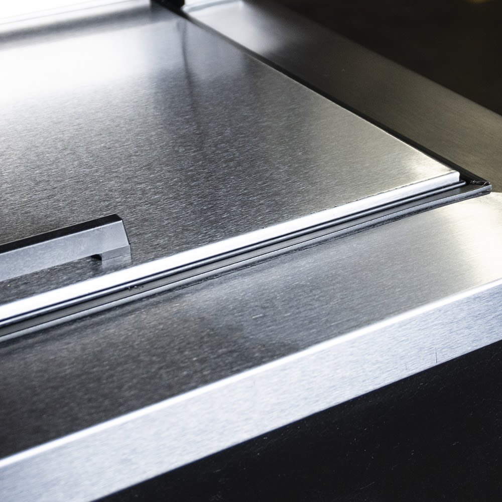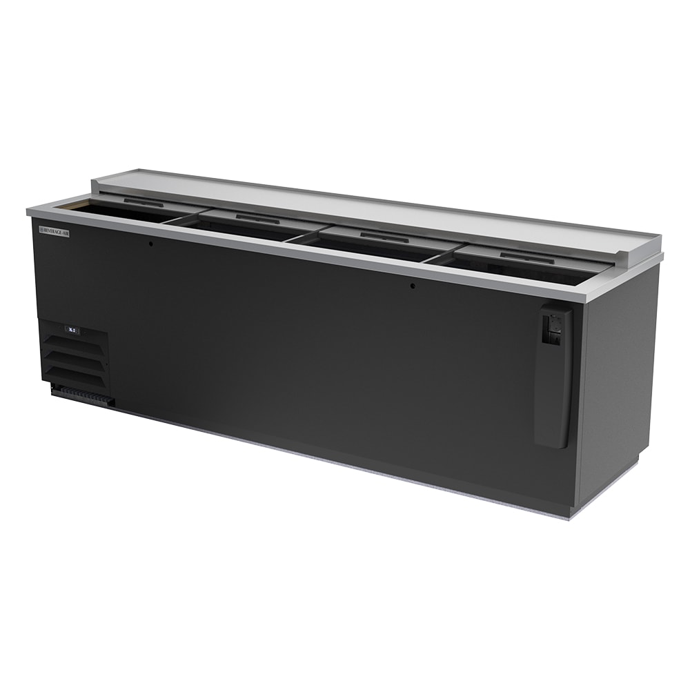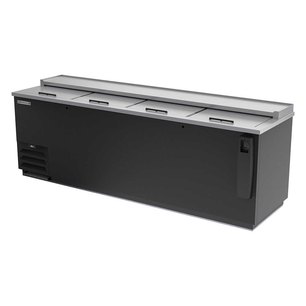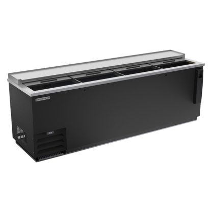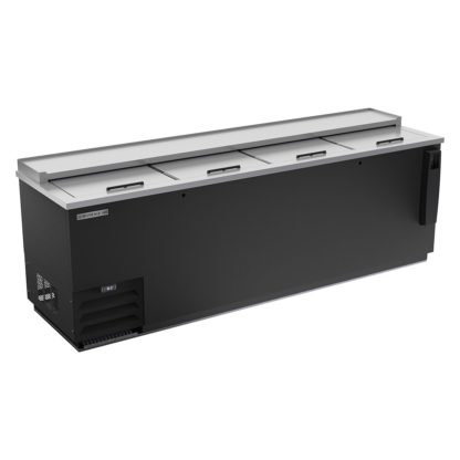 Bottle Cooler, flat top, 95″W, 26-5/8″D, 28.63 cu. ft., (4) sliding lids, (6) adjustable wire dividers, deep well design, bottle cap opener & cap catcher, black vinyl exterior, galvanized interior with stainless steel floor, stainless steel top, self-contained refrigeration system, R290 Hydrocarbon refrigerant, 1/4 HP, UL, cULus, UL EPH Classified, UL-Sanitation, MADE IN USA