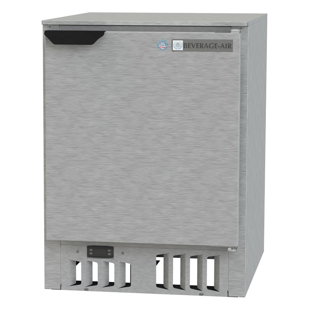 The Beverage Air FLG24HC-1-B one-section glass chiller keeps glasses at -10 degrees Fahrenheit so that beer stays cool. Two adjustable, epoxy-coated shelves support the glasses, and the black vinyl exterior features a galvanized steel back and bottom. Its aluminum interior resists corrosion while the foamed-in-place polyurethane insulation retains cold air. The self-closing door stays open past 120 degrees for loading and unloading glasses. This unit features self-contained refrigeration and a standard interior thermostat that controls the temperature electronically. A condensate evaporator removes moisture.
