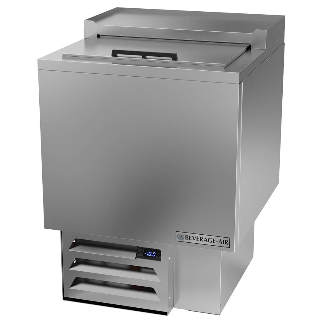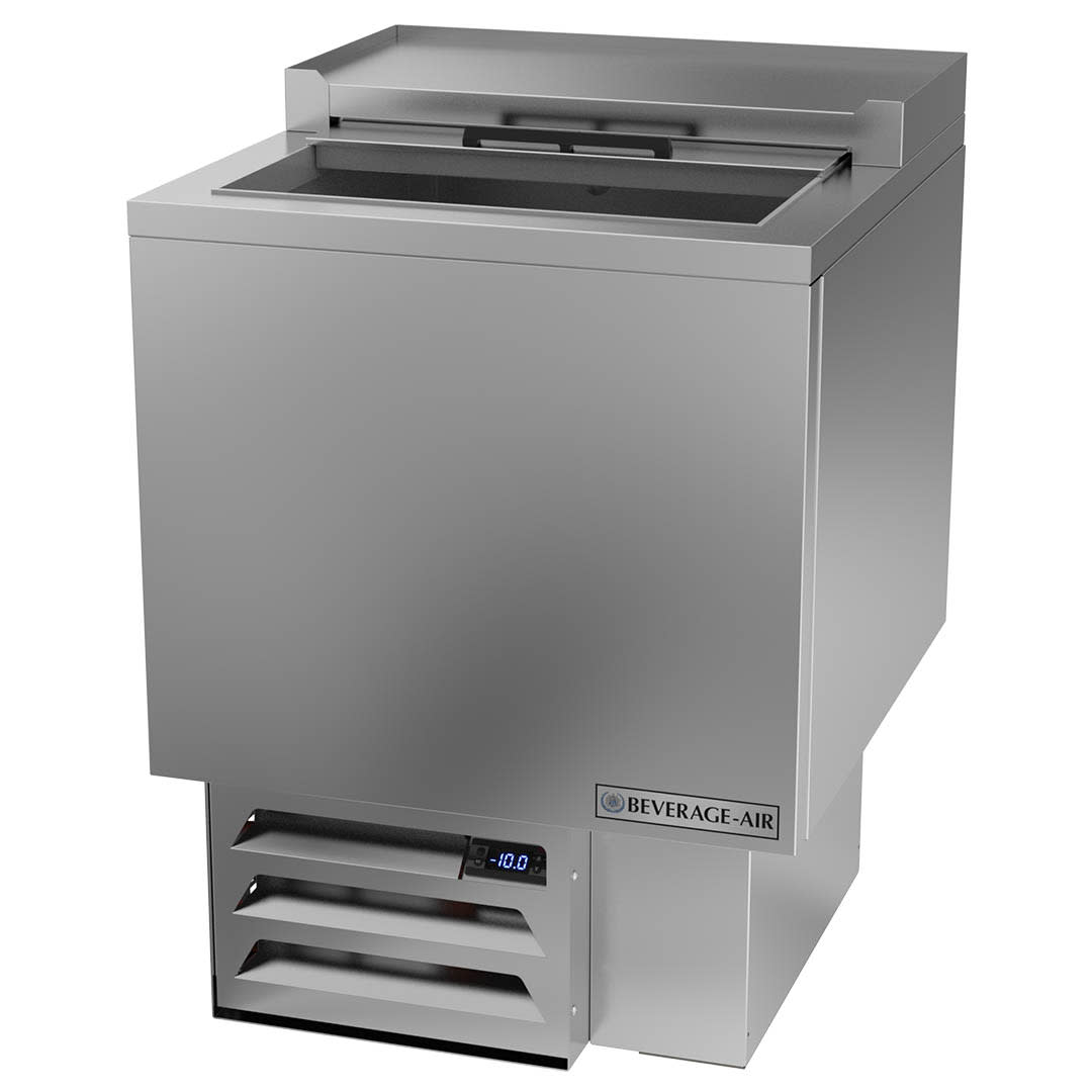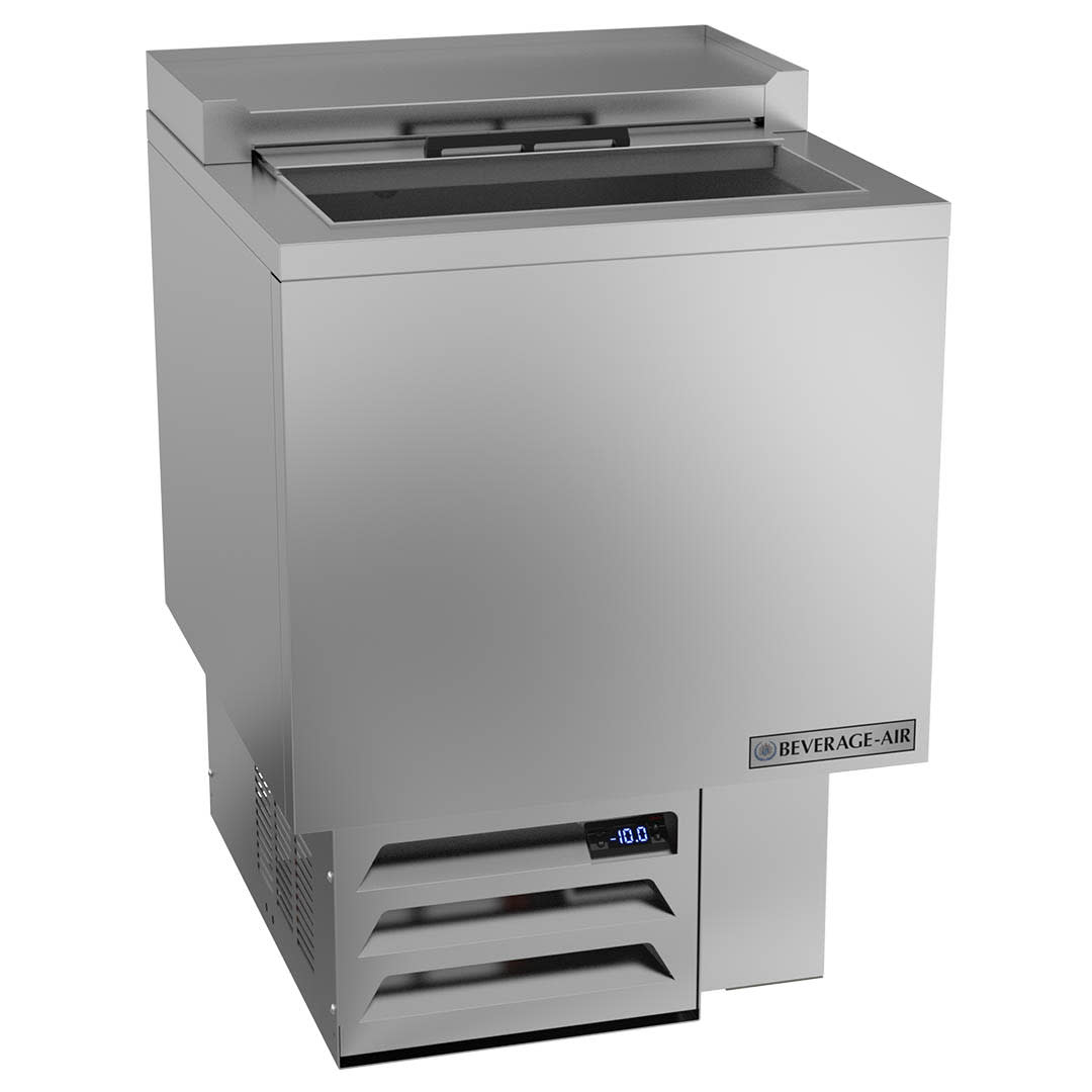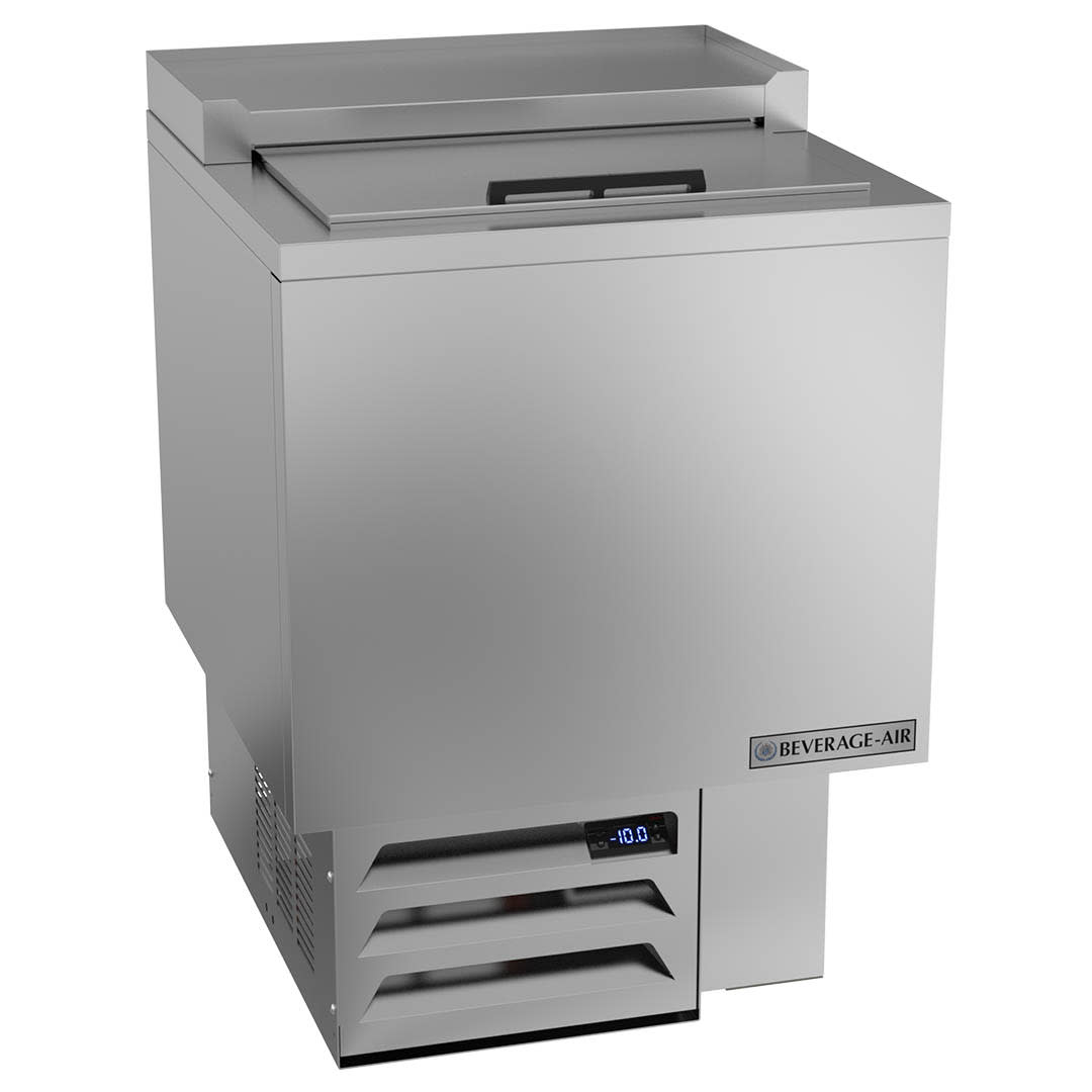 Glass Froster, underbar model, 24″W, 33-5/8″H, 3.67 cu. ft., top opening with (1) sliding door lid, (2) adjustable dividers, (76) 12 oz mugs & (100) 8″ plates capacity, automatic defrost, -10° F operating temperature, stainless steel exterior, galvanized steel interior, self-contained refrigeration, 1/2 HP, cULus, UL EPH Classified, UL-Sanitation, Made in USA