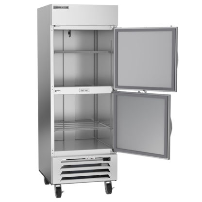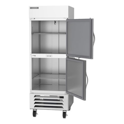 The Beverage Air HBF27HC-1-HS commercial freezer’s Dutch doors give users the ability to access part of the freezer at a time, which decreases thermal loss each time a door is opened. Losing less heat than glass-paned options, the doors are solid. Stainless steel on the freezer’s interior and exterior strengthens it and gives it rust and corrosion resistance.