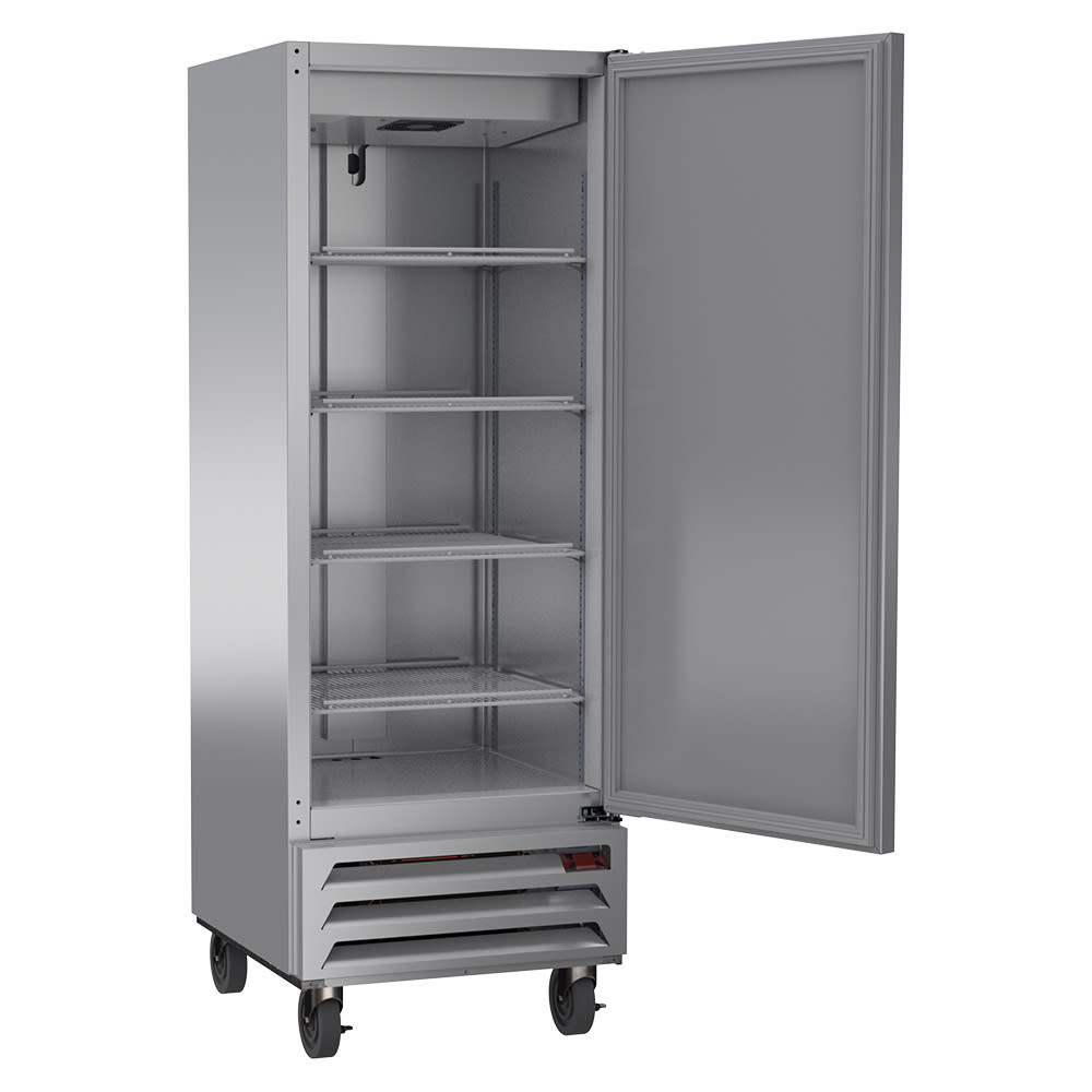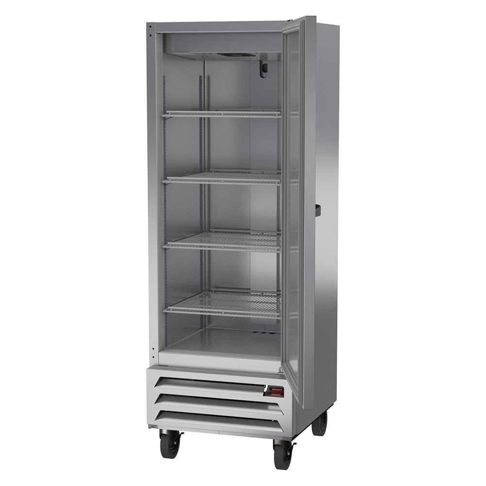 The Beverage Air HBR12HC-1 Horizon Series reach-in refrigerator has a single section, so it’s a good choice for keeping ingredients close at hand in a busy section of the kitchen. Its interior has 12.06 cubic feet of space and users can organize ingredients on its four adjustable shelves. For durability in a high-volume environment, the cabinet is constructed primarily of stainless steel.