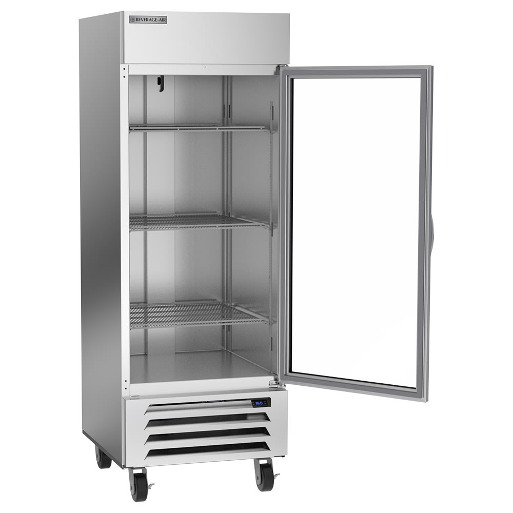 The Beverage Air HBR27HC-1-G Horizon Series refrigerator has 25.88 cubic feet of storage space, giving users plenty of room to hold produce, proteins, and other fresh ingredients. Its interior contains three shelves that can be adjusted to hold products of various heights. Users can access the cabinet interior through the door, which is made of glass for product visibility.