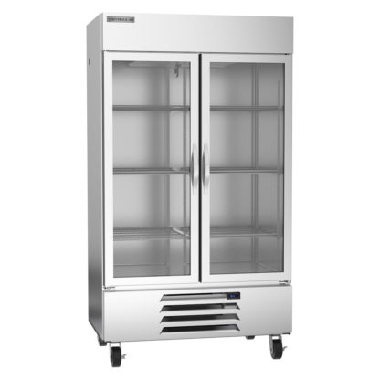 Both doors on the Beverage Air HBR44HC-1-G reach-in refrigerator are self-closing but stay open at 120 degrees to ensure loading product is convenient. The plug-in magnetic door gaskets can be removed for cleaning, and the door handles are constructed to help prevent the spread of bacteria. Six wire shelves are installed in the unit; each shelf is coated in heavy-duty epoxy to resist corrosion. The 6-inch-tall casters come standard with two brakes, giving this mobile unit semi-permanent capability. Operators can adjust the temperature setting to any point between 36 and 38 degrees Fahrenheit.