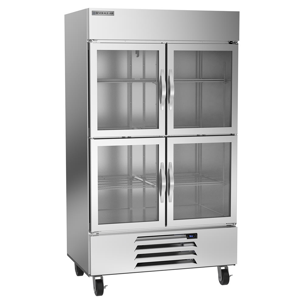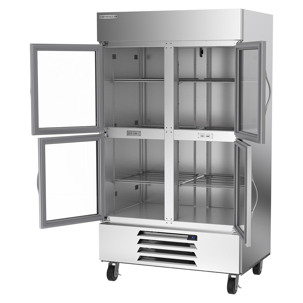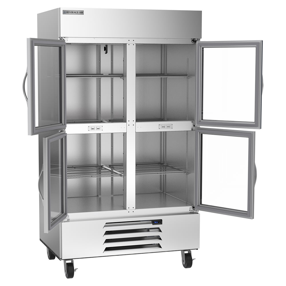 The Beverage Air HBR44HC-1-HG Horizon Series refrigerator is a two-section unit with four half-doors. Its doors are made of glass, enabling users to conserve cabinet chill by taking inventory of product without opening the door. For enhanced product visibility, LED fixtures brighten the cabinet.
