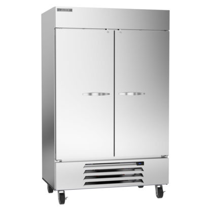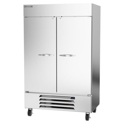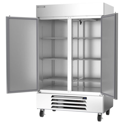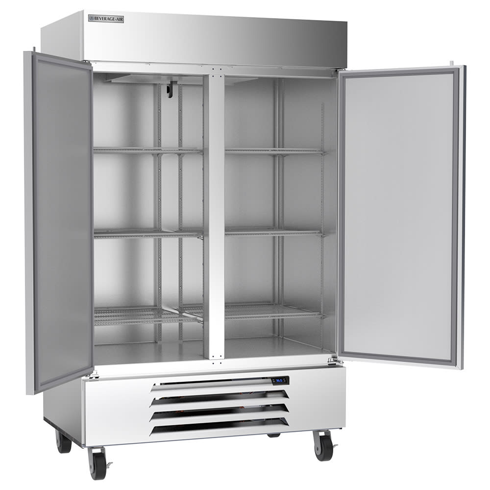 The Beverage Air HBR49HC-1 two-section reach-in refrigerator holds stored items on six epoxy-coated wire shelves. Lighting in the cabinet improves visibility, and its stainless steel construction is heavy duty and resistant to corrosion. The doors self-close to retain cold air and stay open past 120 degrees to ease loading and unloading. The Beverage Air HBR49HC-1 two-section refrigerator has magnetic gaskets around the doors that prevent cold air leaks.