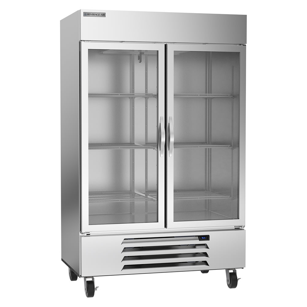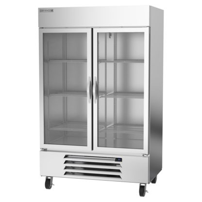 Glass doors on the Beverage Air HBR49HC-1-G reach-in refrigerator provide an unobstructed view to the cabinet’s interior so users can locate products before opening the door. The refrigerator has six adjustable shelves made of heavy-duty wire to support stored items and enable air to flow freely. To fit different sizes of containers, users can adjust the shelves to modify the space. LED lighting is installed in the cabinet, enabling users to read labels and take inventory.