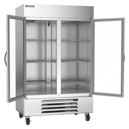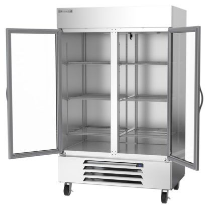 The Beverage Air HBR49HC-1-G two-section reach-in refrigerator rolls on a set of four 6-inch casters, enabling users to move the refrigerator in order to clean the floor or access the rear of the unit. Users can pull the doors open 120 degrees to prevent them from slamming while loading or cleaning the cooler.