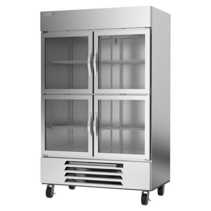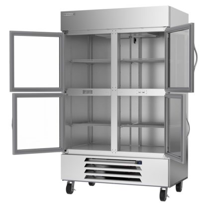 There are six heavy-duty wire shelves inside the Beverage Air HBR49HC-1-HG two-section reach-in refrigerator. An epoxy coating is applied to the shelves for corrosion resistance and strength. With LED interior lighting, the cabinet is brightened to increase product visibility. The four half doors are made of glass, so users can see the stored items from outside the cabinet. The self-closing door design keeps cold air inside the cabinet, while the stay-open feature holds the doors open past 120 degrees.
