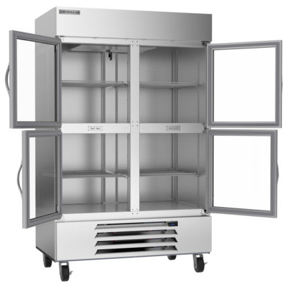 - 4 half glass doors are self-closing to ensure cold air stays inside the cabinet