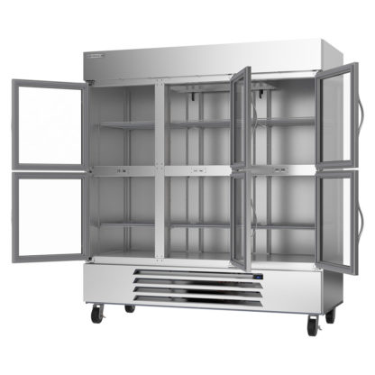 To accommodate myriad products, the Beverage Air HBR72HC-1-HG reach-in refrigerator has nine adjustable shelves. The six doors all are made of glass to offer an interior view of stored contents, and they open to reveal three sections and 68.93 cubic feet of interior space. Ensuring employees can find what they’re looking for quickly, the cabinet is illuminated by LED lights.