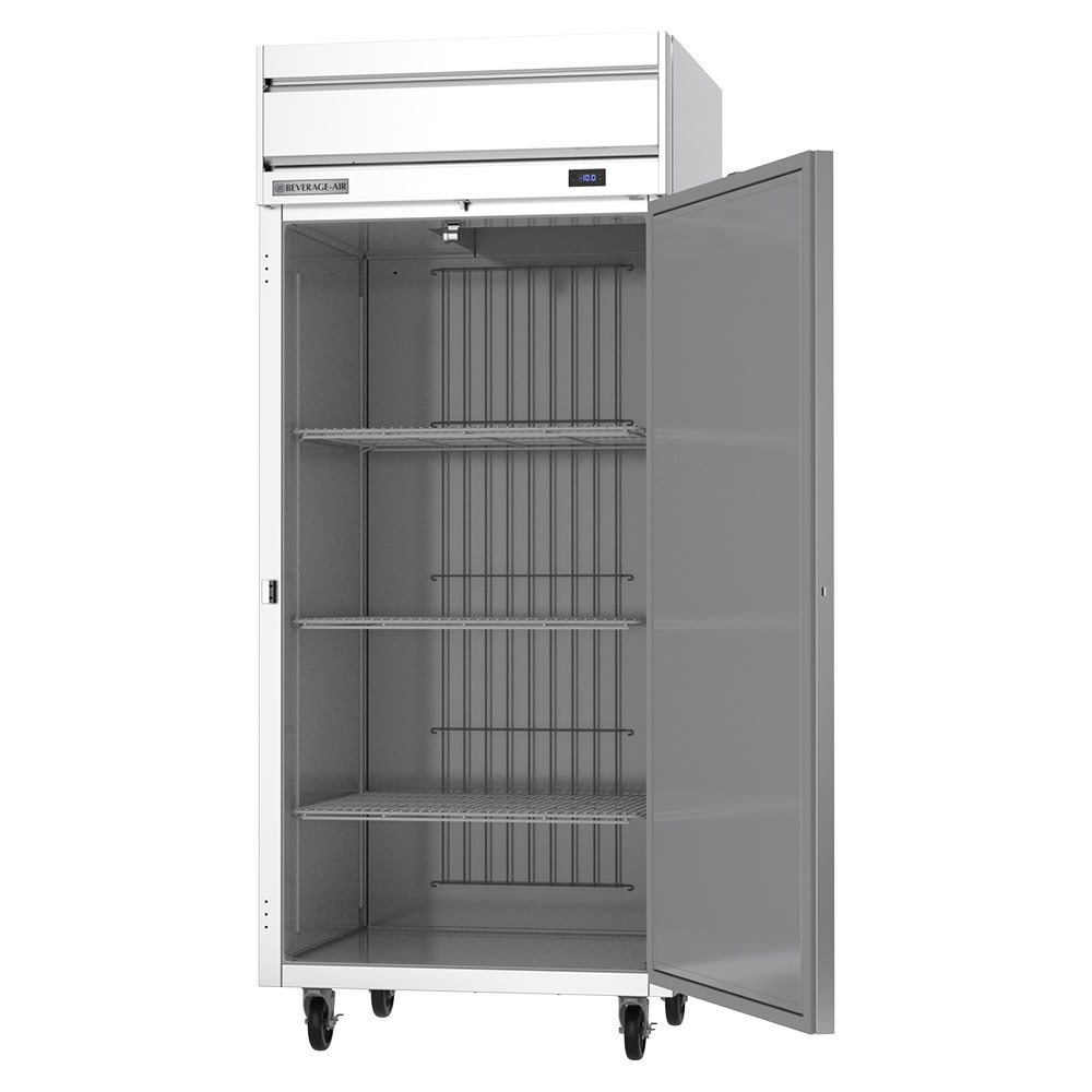 This Beverage Air HF1WHC-1S reach-in freezer has a self-contained refrigeration system mounted on top of the unit. The system uses thermal expansion valves to distribute refrigerant through its coils, keeping the freezer’s interior cold when its door is opened repeatedly. It also uses an automatic defrost to melt frost buildup whenever necessary.