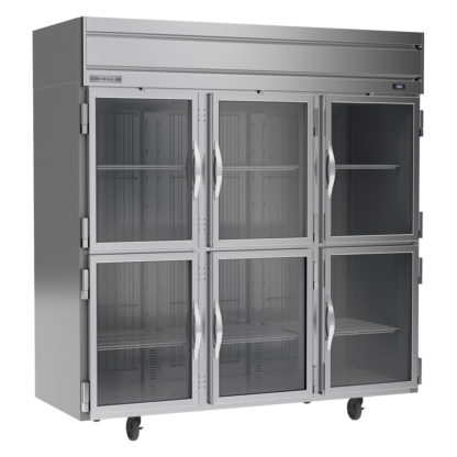 Horizon Series Freezer, reach-in, three-section, 78″W, 85″ H, 69.1 cu. ft. capacity, (2) center half glass doors right-hand hinged, (2) right half glass doors right-hand hinged, (2) left half glass doors left-hand hinged, door locks, (9) adjustable shelves, electronic control, LED interior lighting, digital display, expansion valve technology, automatic defrost, top-mounted self-contained refrigeration, R290 Hydrocarbon refrigerant, stainless steel front, gray painted sides, aluminum interior, (2) 3/4 HP, cULus, UL EPH Classifed, UL-Sanitation, Made in USA