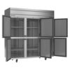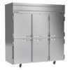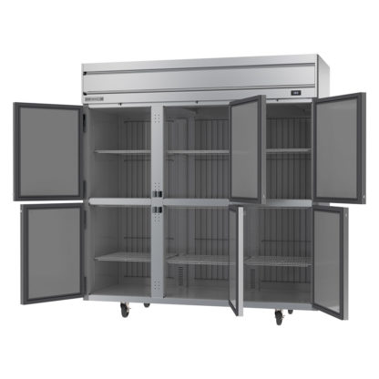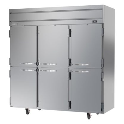 Horizon Series Freezer, reach-in, three-section, 78″W, 85″ H, 69.1 cu. ft. capacity, (2) center half solid doors right-hand hinged, (2) right half solid doors right-hand hinged, (2) left half solid doors left-hand hinged, door locks, (9) adjustable shelves, electronic control, LED interior lighting, digital display, expansion valve technology, automatic defrost, top-mounted self-contained refrigeration, R290 Hydrocarbon refrigerant, stainless steel front, gray painted sides, aluminum interior, (2) 3/4 HP, cULus, UL EPH Classifed, UL-Sanitation, Made in USA