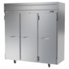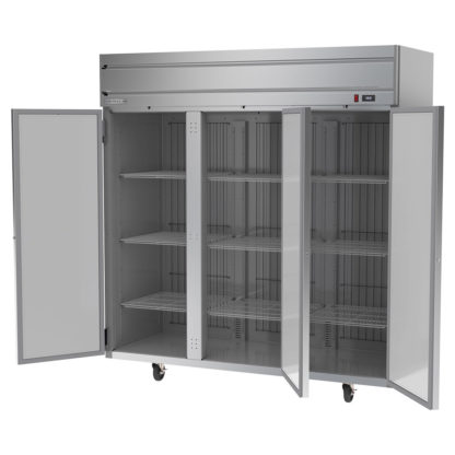 Horizon Series Freezer, reach-in, three-section, 78″W, 85″ H, 69.1 cu. ft. capacity, (1) center solid door right-hand hinged, (1) right solid door right-hand hinged, (1) left solid door left-hand hinged, door locks, (9) adjustable shelves, electronic control, LED interior lighting, digital display, expansion valve technology, automatic defrost, top-mounted self-contained refrigeration, R290 Hydrocarbon refrigerant, stainless steel front, gray painted sides, aluminum interior, (2) 3/4 HP, cULus, UL EPH Classifed, UL-Sanitation, Made in USA