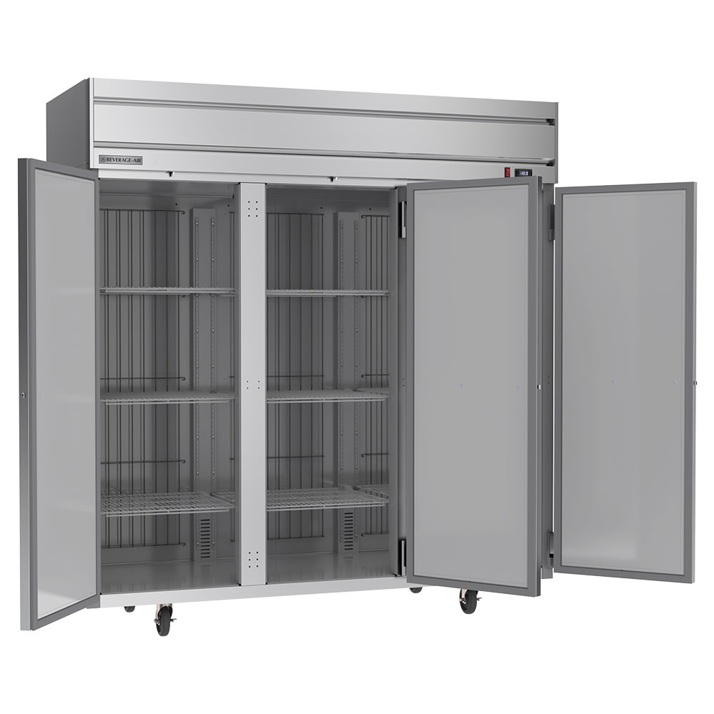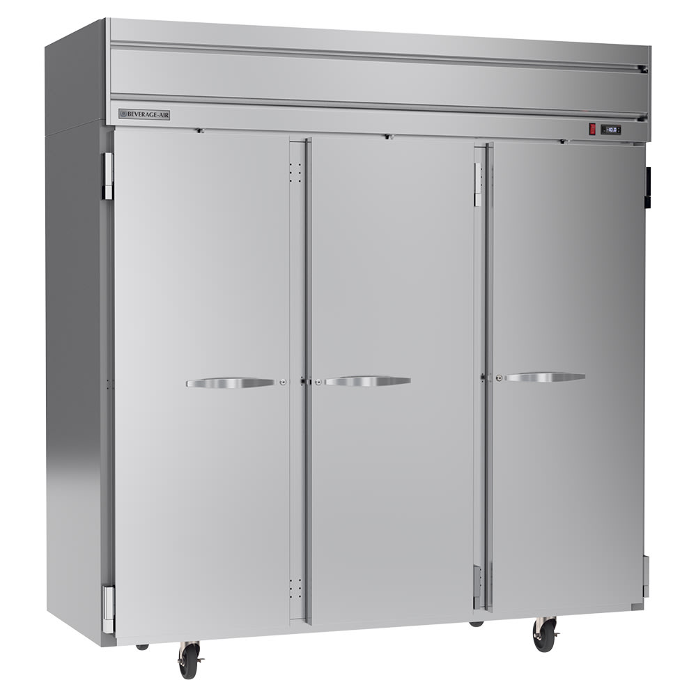 The Beverage Air HF3HC-1S three-section reach-in freezer is supported by heavy-duty casters that enable users to push it from place to place. Locking brakes on two of the casters secure the unit in one spot and prevent sliding during loading and unloading. This freezer is constructed of stainless steel and aluminum-sturdy materials that resist denting, sagging, and corroding even with recurrent use.