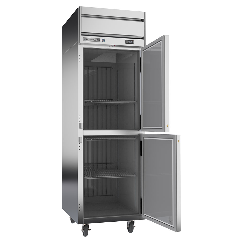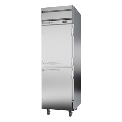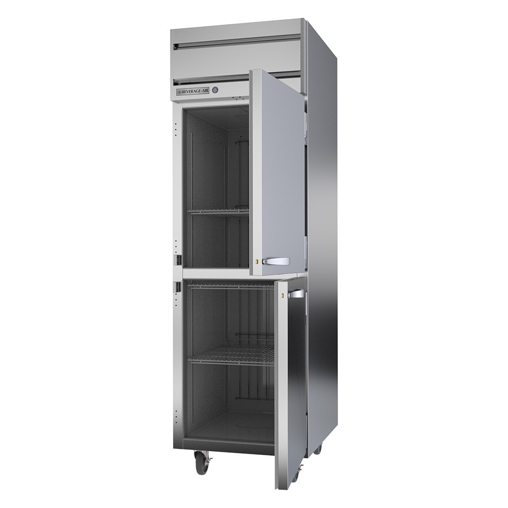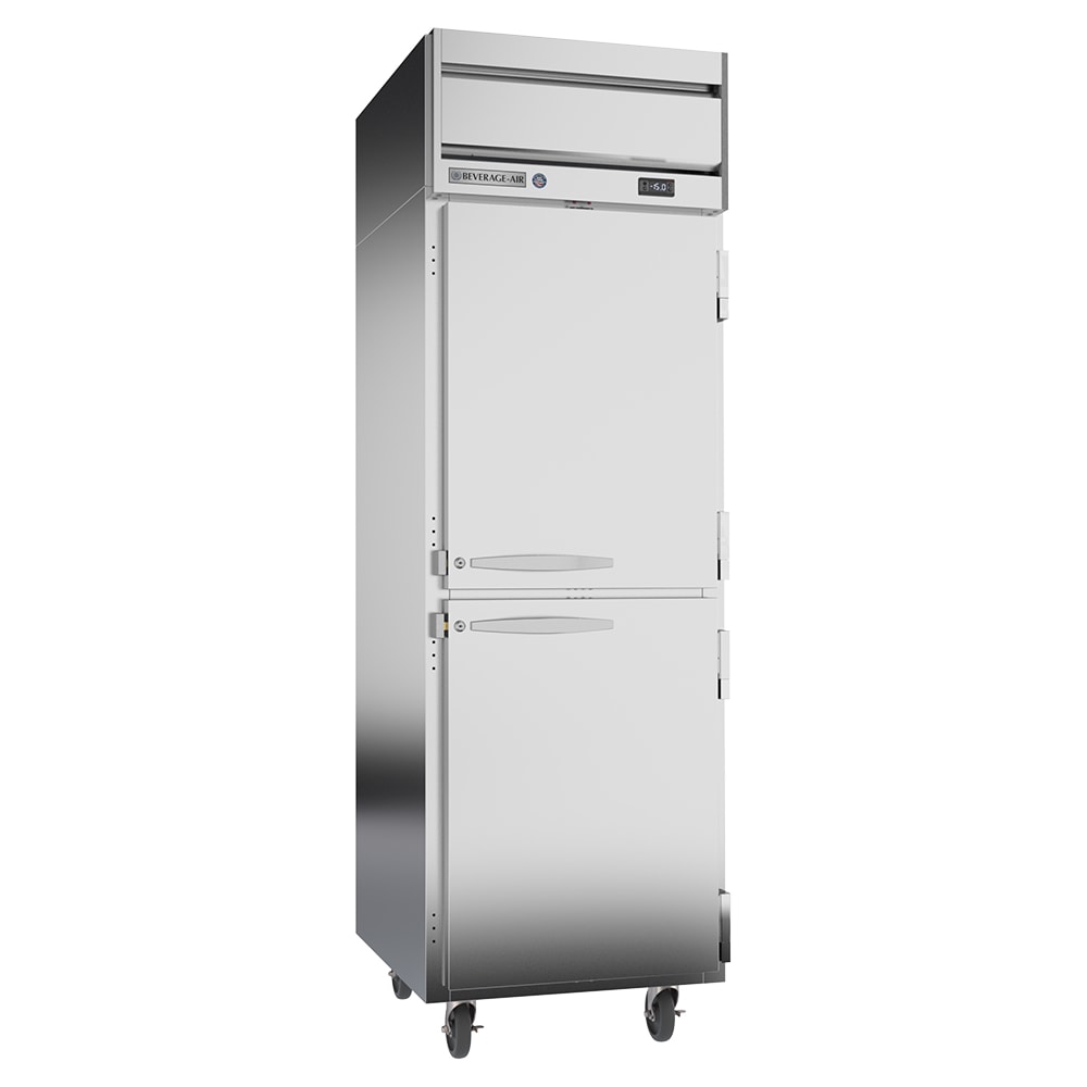 Slim and compact, the Beverage Air HFP1HC-1HS reach-in freezer measures only 26 inches wide and has a self-contained refrigeration system for efficient usage of space. Its solid doors seal out light and heat better than glass alternatives and open independently to reduce air loss. The handles are antimicrobial, resisting the spread of germs in the most commonly touched area of the unit. Stainless steel front and sides provide a smooth surface that streamlines cleaning.
