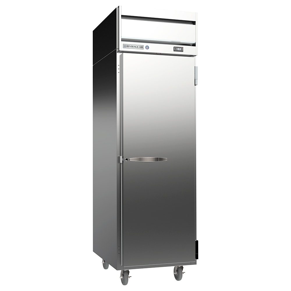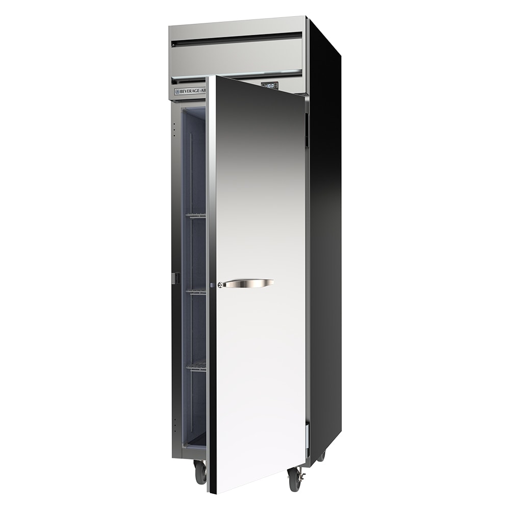 The Beverage Air HFP1HC-1S one-section freezer utilizes environmentally friendly R290 refrigerant to effectively maintain temperatures at 0 degrees Fahrenheit or below. Its self-closing door features a 120-degree stay-open option for comfortable loading. For smooth mobility, his unit is mounted on 6-inch casters.