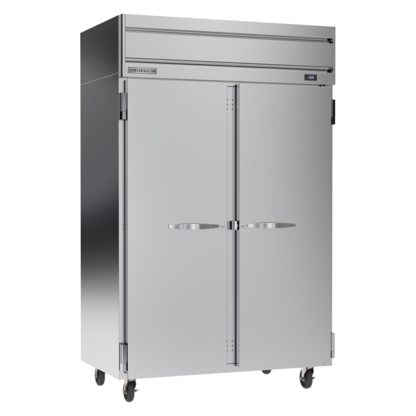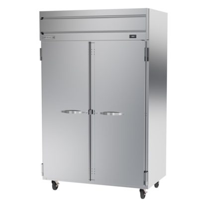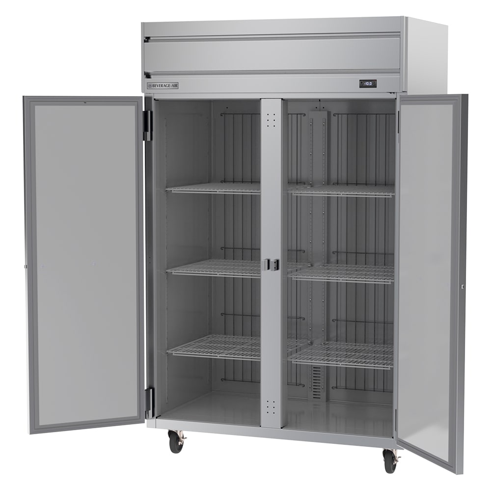 The Beverage Air HFP2HC-1S reach-in freezer maintains temperatures as low as –10 degrees Fahrenheit and retains cold air using snap-in magnetic door gaskets. It features full electronic controls and LED interior lighting, and to prevent cross-contamination, its door handles are treated with an antimicrobial agent.