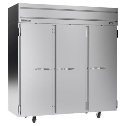 With epoxy-coated shelves and an aluminum interior liner, the Beverage Air HFP3HC-1S reach-in freezer can withstand repeated exposure to moisture. It cools using R290 refrigerant and features an evaporator coil coated in epoxy. Each of the three sections have a self-closing door.