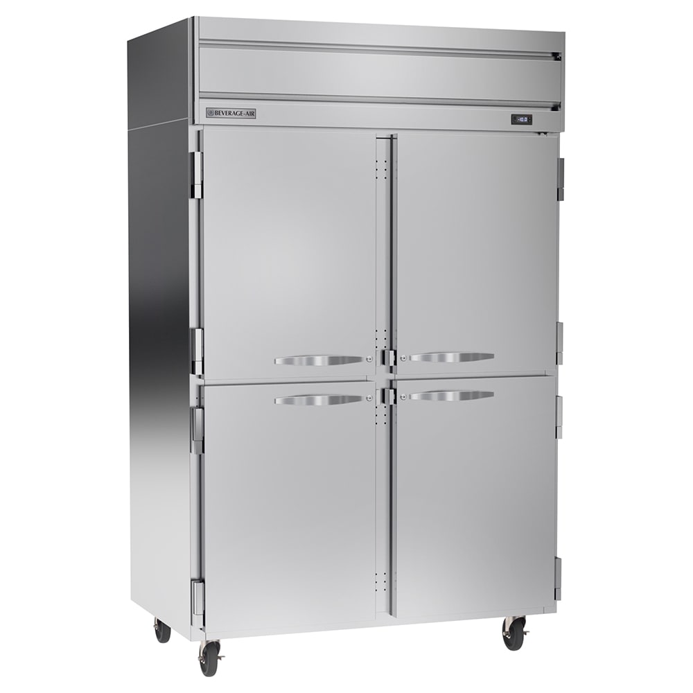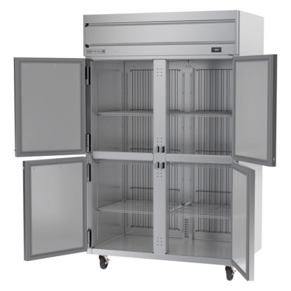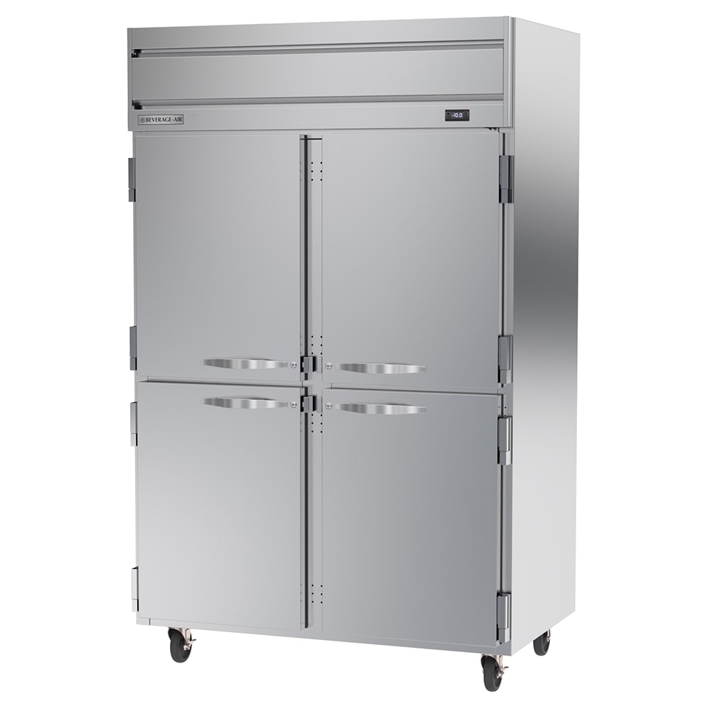 The two sections of the Beverage Air HFPS2HC-1HS reach-in freezer have an overall interior space of 45.2 cubic feet. Storage is provided with six shelves, which can be adjusted as needed to accommodate a versatile range of product. An epoxy coating on the shelves protects them from corrosion, and they are made of wire to promote uniform airflow around stored goods. The four solid doors have locks to secure product and seal shut with magnetic gaskets so cold air doesn’t escape.