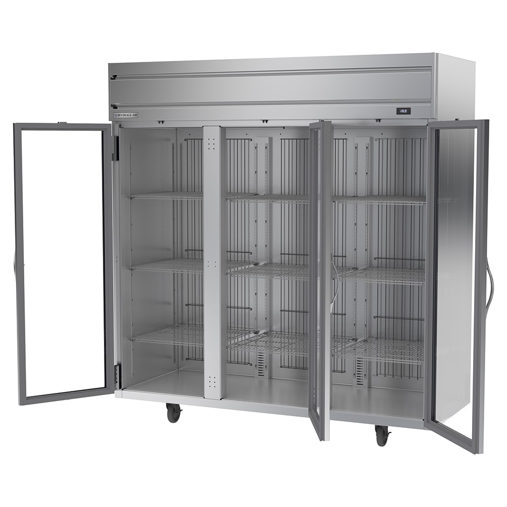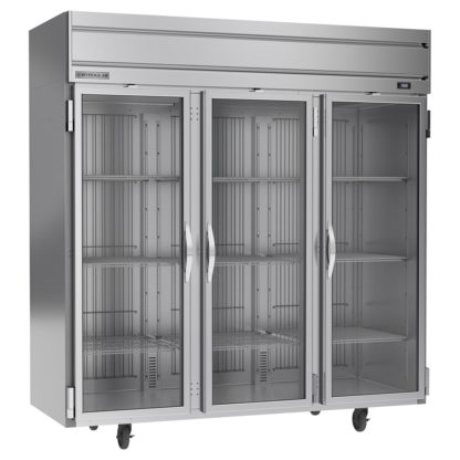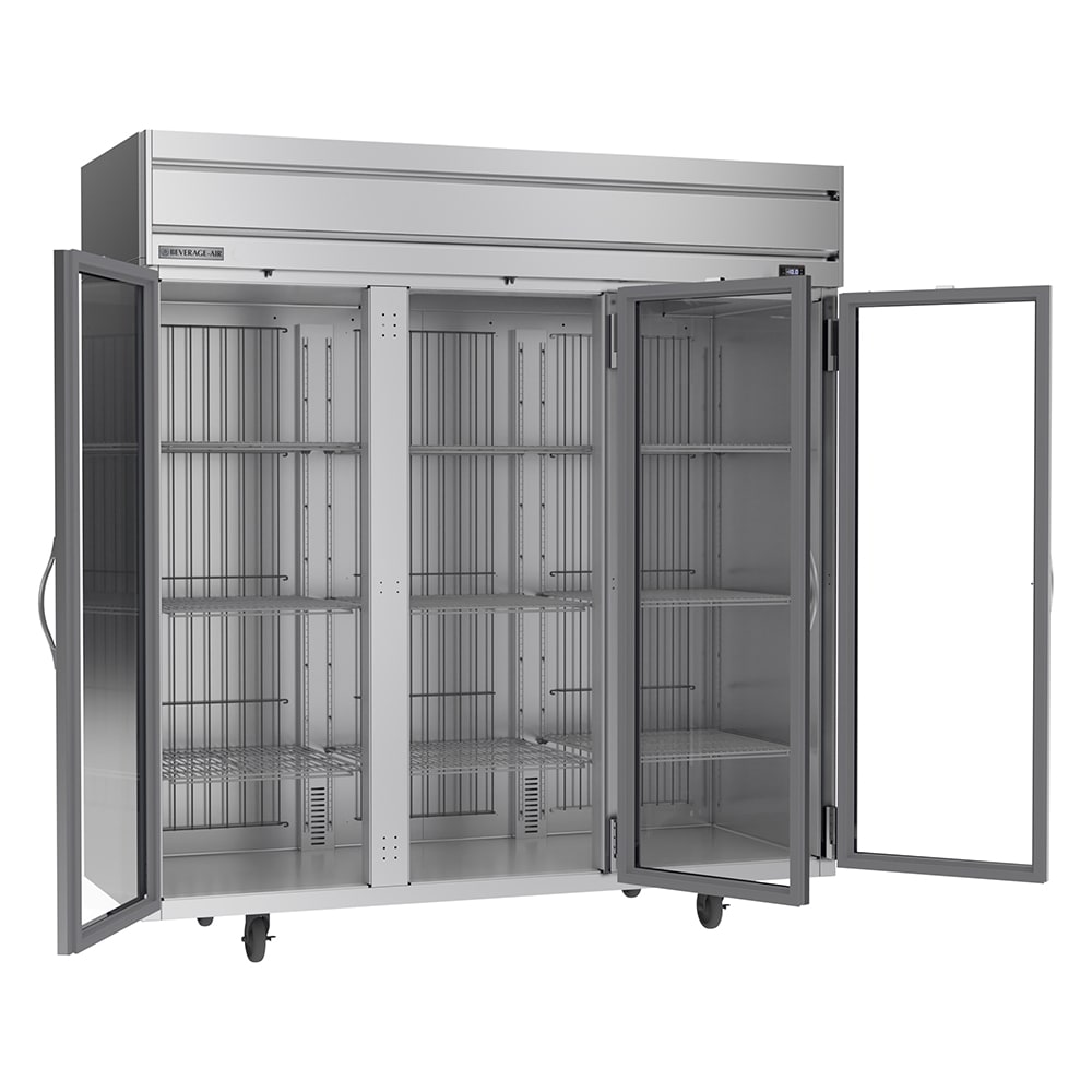 The Beverage Air HFPS3HC-1G reach-in freezer has three see-through glass doors and bright LED lights in the cabinet to provide a view inside without losing energy. All nine of the shelves are epoxy coated for protection against corrosion and made of wire so cold air flows freely around stored product. Providing mobility throughout the kitchen, this unit is positioned on 6-inch casters. For durability, the interior and exterior are made of stainless steel.