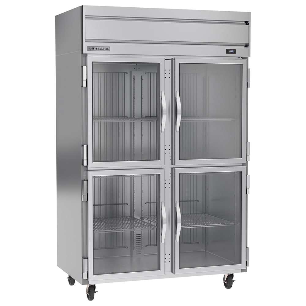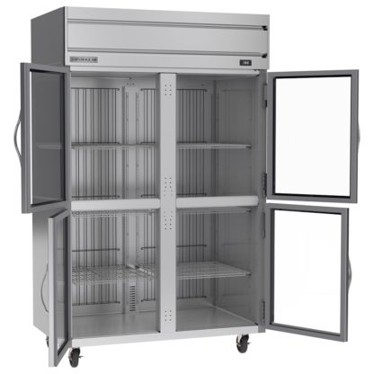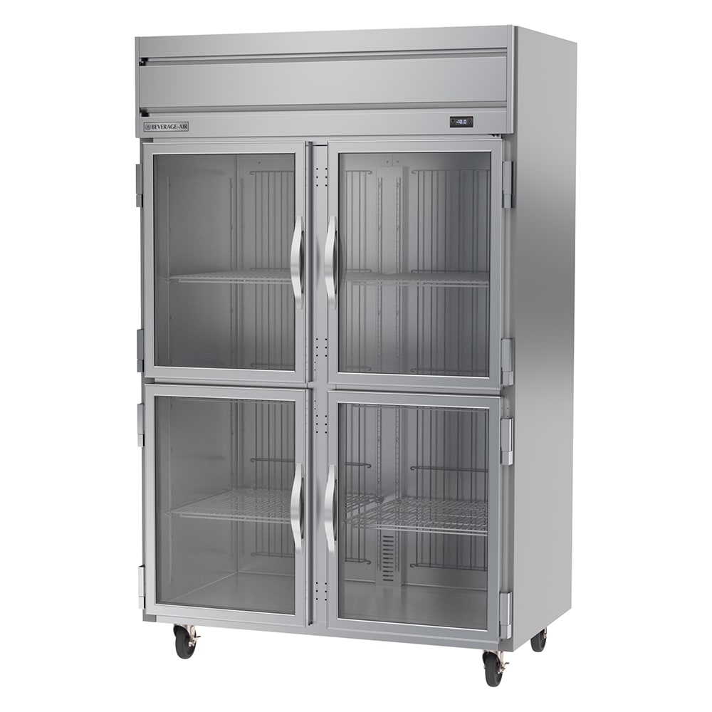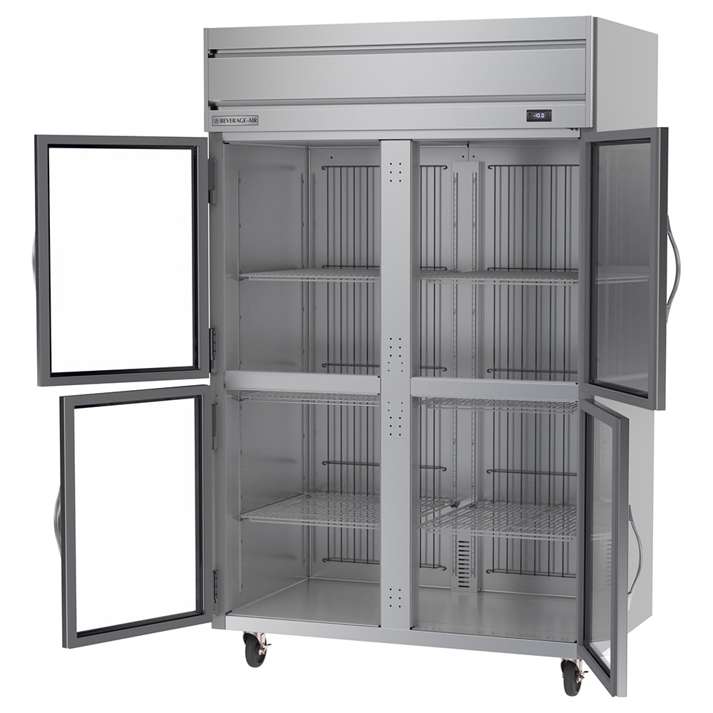 Made of stainless steel, the Beverage Air HFS2HC-1HG two-section freezer is durable and corrosion resistant. It has an interior space of 46.29 cubic feet to hold a variety of product on its six adjustable shelves. Since these shelves are made of wire, air flows through the gaps to keep everything stored at a consistent temperature. The shelves and the evaporator coil are epoxy coated to protect them from corrosion. This unit has four doors that provide access to the cabinet, and they each have stay-open and self-closing capabilities.