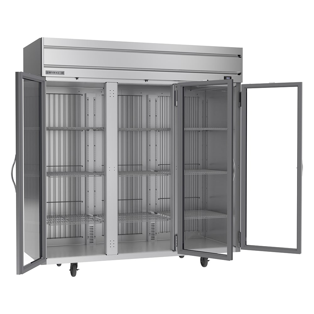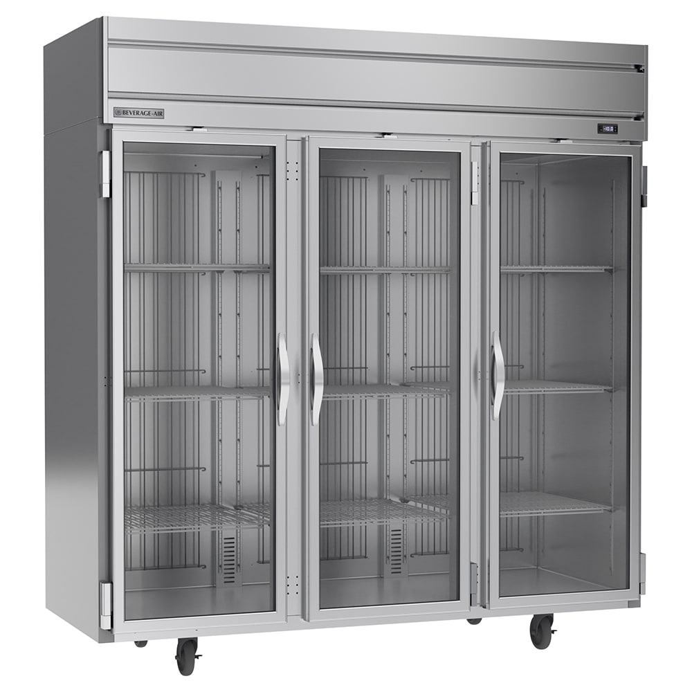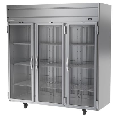 Horizon Series Freezer, reach-in, three-section, 69.1 cu. ft., (1) center glass door right-hand hinged, (1) right glass door right-hand hinged, (1) left glass doors left-hand hinged, (9) adjustable shelves, electronic control, LED interior lighting, digital display, expansion valve technology, automatic defrost, top-mounted self-contained refrigeration, stainless steel front, gray painted sides, stainless steel interior, (2) 3/4 HP, cULus, UL EPH Classified, UL-Sanitation, Made in USA