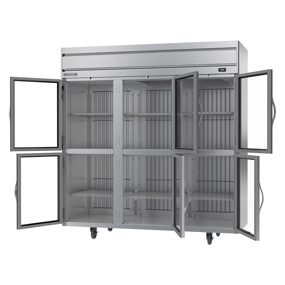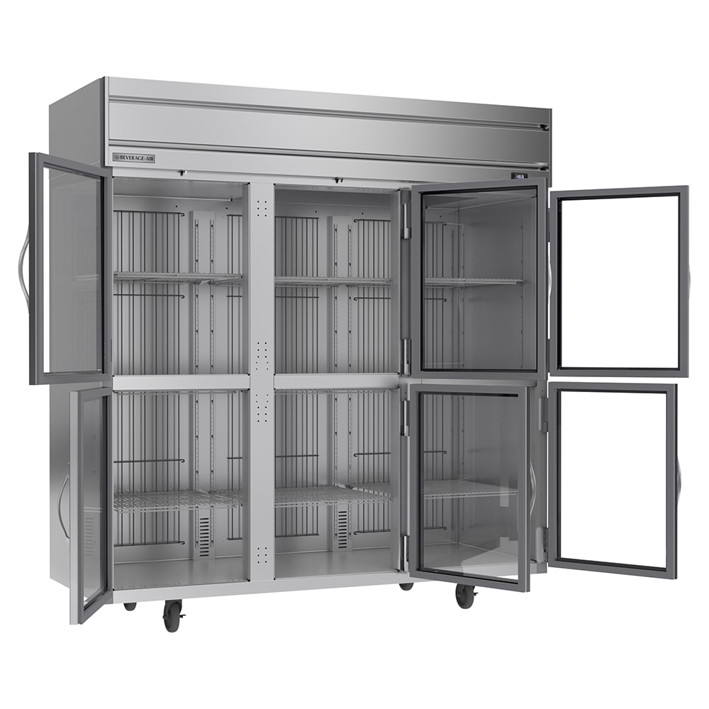 Horizon Series Freezer, reach-in, three-section, 69.1 cu. ft., (2) center half glass doors right-hand hinged, (2) right half glass doors right-hand hinged, (2) left half glass doors left-hand hinged, (9) adjustable shelves, electronic control, LED interior lighting, digital display, expansion valve technology, automatic defrost, top-mounted self-contained refrigeration, stainless steel front, gray painted sides, stainless steel interior, (2) 3/4 HP, cULus, UL EPH Classified, UL-Sanitation, Made in USA