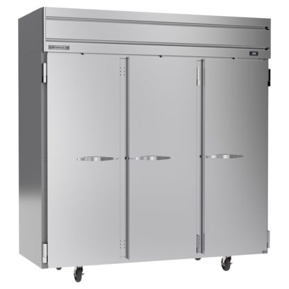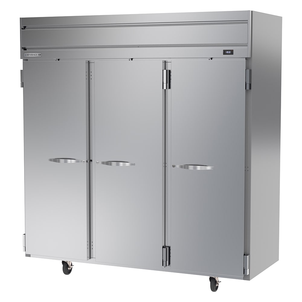 The Beverage Air HFS3HC-1S Horizon Series reach-in freezer has three sections for a large holding capacity. Each section has a solid door that can be locked to prevent product theft. On the unit’s interior, adjustable, epoxy-coated shelves hold products while LED fixtures provide light.