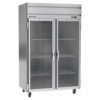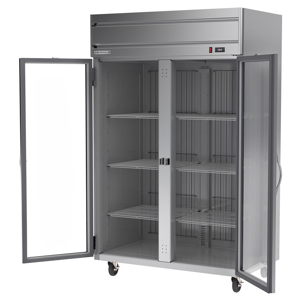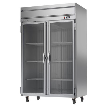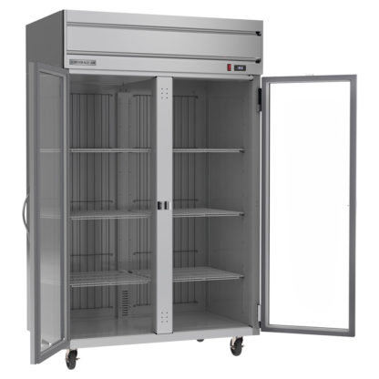 Horizon Series Refrigerator, reach-in, two-section, 52″W, 85″H, 46.88 cu. ft. capacity, (1) right-hand hinged glass door, (1) left-hand hinged glass door, (6) shelves, electronic control, LED interior lighting, digital display, stainless steel front, gray painted sides, aluminum interior, top-mounted self-contained refrigeration, R290 Hydrocarbon refrigerant, Variable Speed Technology, cULus, UL EPH Classified, UL-Sanitation, Made in USA