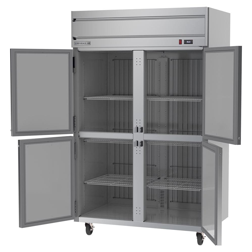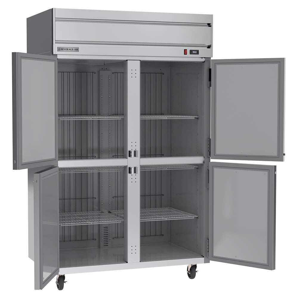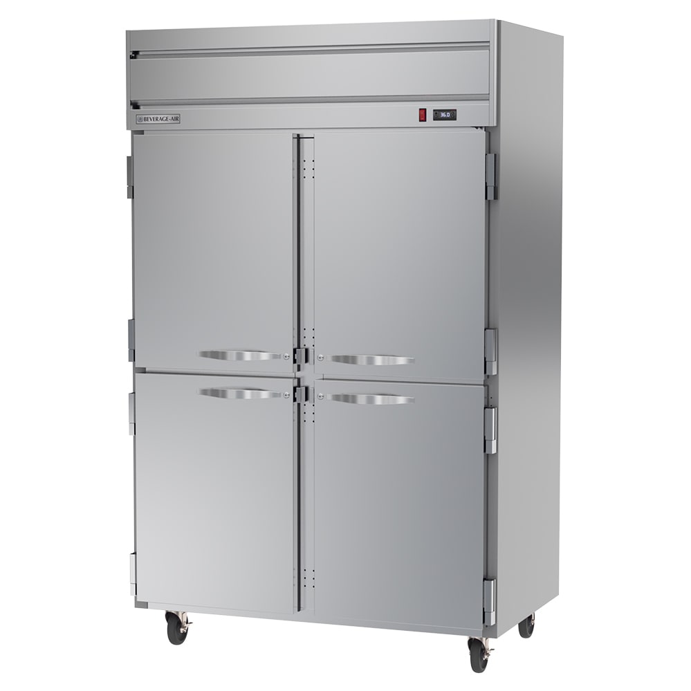 The two sections in this Beverage Air HR2HC-1HS Horizon series refrigerator provide plenty of storage space for cold items. Reducing heat transfer when users are grabbing product, these compartments are split into four smaller sections by half-height doors. To minimize cold air loss compared to glass doors, these doors are solid, and their field-reversible design accommodates different kitchen layouts.