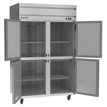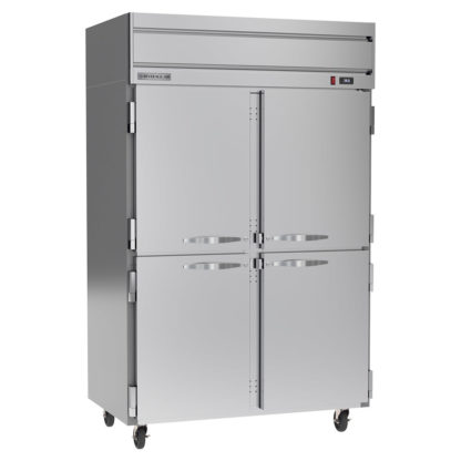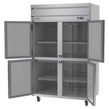 Horizon Series Refrigerator, reach-in, two-section, 52″W, 85″H, 45.2 cu. ft. capacity, (2) right-hand hinged half solid doors, (2) left-hand hinged half solid doors, door locks, (6) shelves, electronic control, LED interior lighting, digital display, stainless steel front, gray painted sides, aluminum interior, top-mounted self-contained refrigeration, R290 Hydrocarbon refrigerant, Variable Speed Technology, cULus, UL EPH Classified, UL-Sanitation, Made in USA