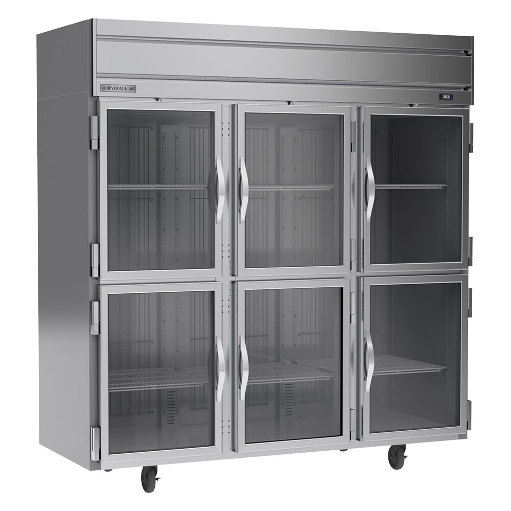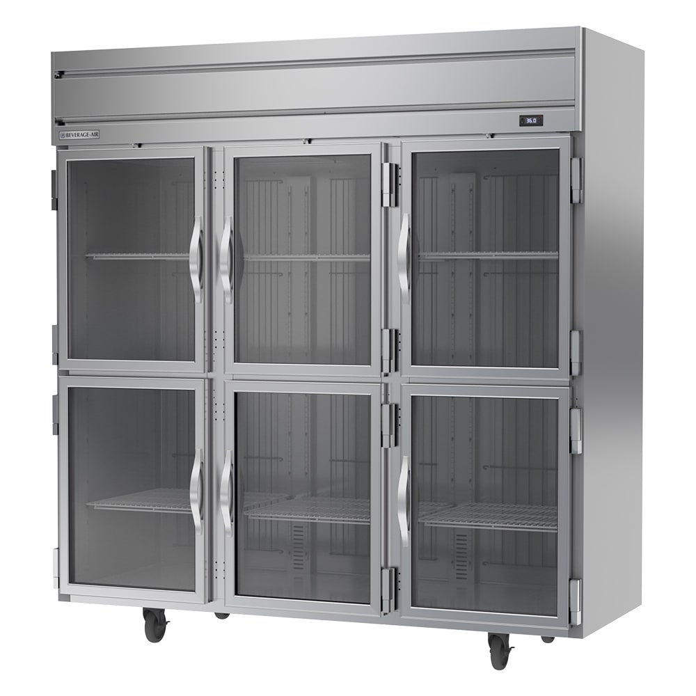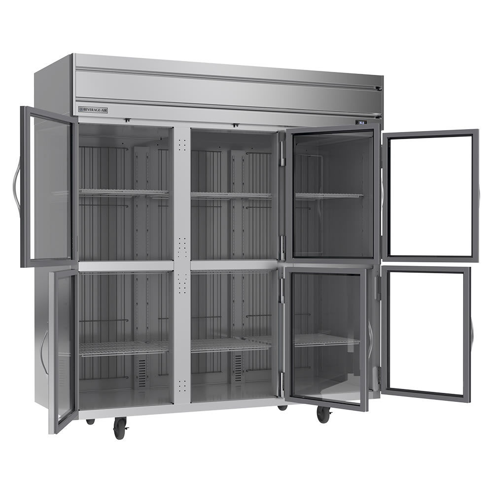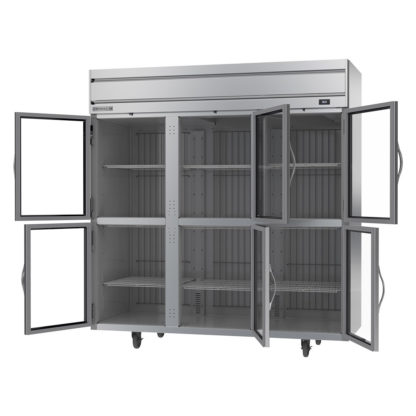 Horizon Series Refrigerator, reach-in, three-section, 78″W, 85″H, 71.52 cu. ft. capacity, (2) center half glass doors right-hand hinged, (2) right half glass doors right-hand hinged, (2) left half glass doors left-hand hinged, (9) shelves, electronic control, LED interior lighting, digital display, stainless steel front, gray painted sides, aluminum interior, top-mounted self-contained refrigeration, R290 Hydrocarbon refrigerant, Variable Speed Technology, cULus, UL EPH Classified, UL-Sanitation, Made in USA